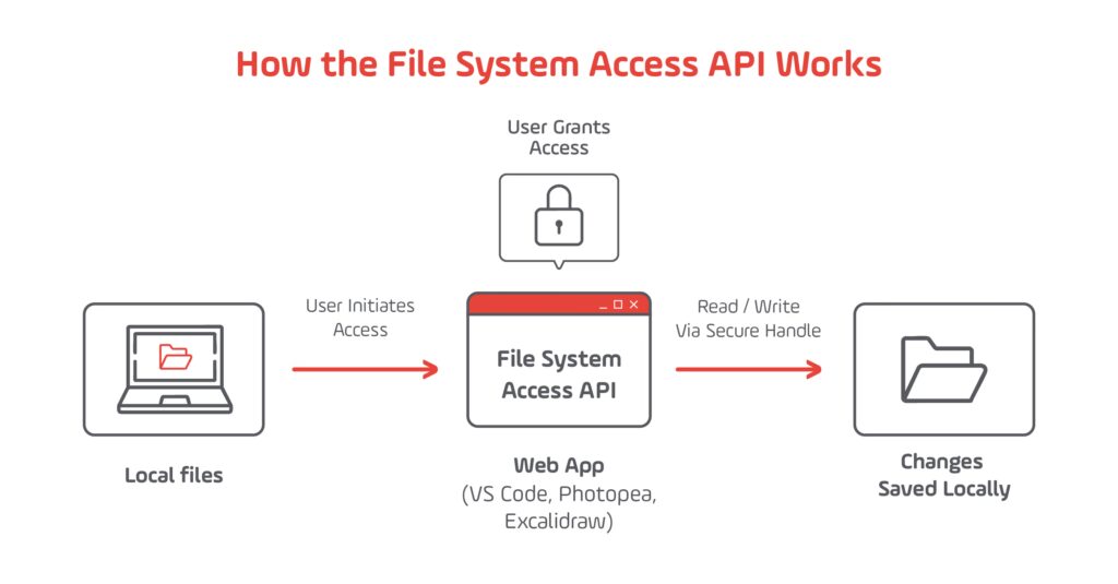 The File System Access API lets developers open and save files directly from the local environment using asynchronous JavaScript methods. Once the user grants permission, the browser provides handles to read or modify files securely.