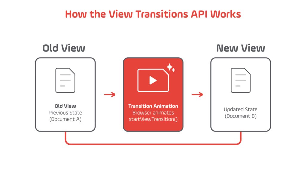 The View Transitions API works by wrapping DOM updates inside a document.startViewTransition() call. The browser takes a visual snapshot of the current state, executes the DOM changes, then animates between the old and new states using CSS pseudo-elements.